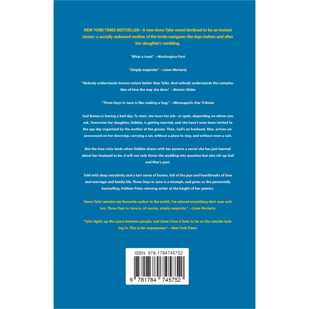 رمان جدید آن تایلر که قرار است به یک اثر کلاسیک فوری تبدیل شود: مادری از نظر اجتماعی دست و پا چلفتی که در روزهای قبل و بعد از عروسی دخترش به این سو و آن سو میرود. گیل بینز روز بدی را سپری میکند. برای شروع، او شغلش را از دست میدهد - یا استعفا میدهد، بسته به اینکه از چه کسی بپرسید. فردا دخترش، دبی، عروسی میکند، و او حتی به روز اسپا که توسط مادر داماد ترتیب داده شده دعوت نشده است. سپس، همسر سابق گیل، مکس، بدون اطلاع قبلی، با یک گربه، بدون جایی برای ماندن، و حتی بدون کت و شلوار، به در خانهاش میآید. اما بحران واقعی زمانی رخ میدهد که دبی رازی را با والدینش در میان میگذارد که به تازگی در مورد همسر آیندهاش فهمیده است. این موضوع نه تنها عروسی را زیر سوال میبرد، بلکه گذشته گیل و مکس را نیز برمیانگیزد. سه روز در ماه ژوئن با حساسیت عمیق و حس شوخ طبعی گزنده، مملو از شادیها و دل شکستگیهای عشق و ازدواج و زندگی خانوادگی، یک پیروزی است و نویسندهی پرفروش و برنده جایزه پولیتزر را در اوج قدرت خود به ما نشان میدهد.
